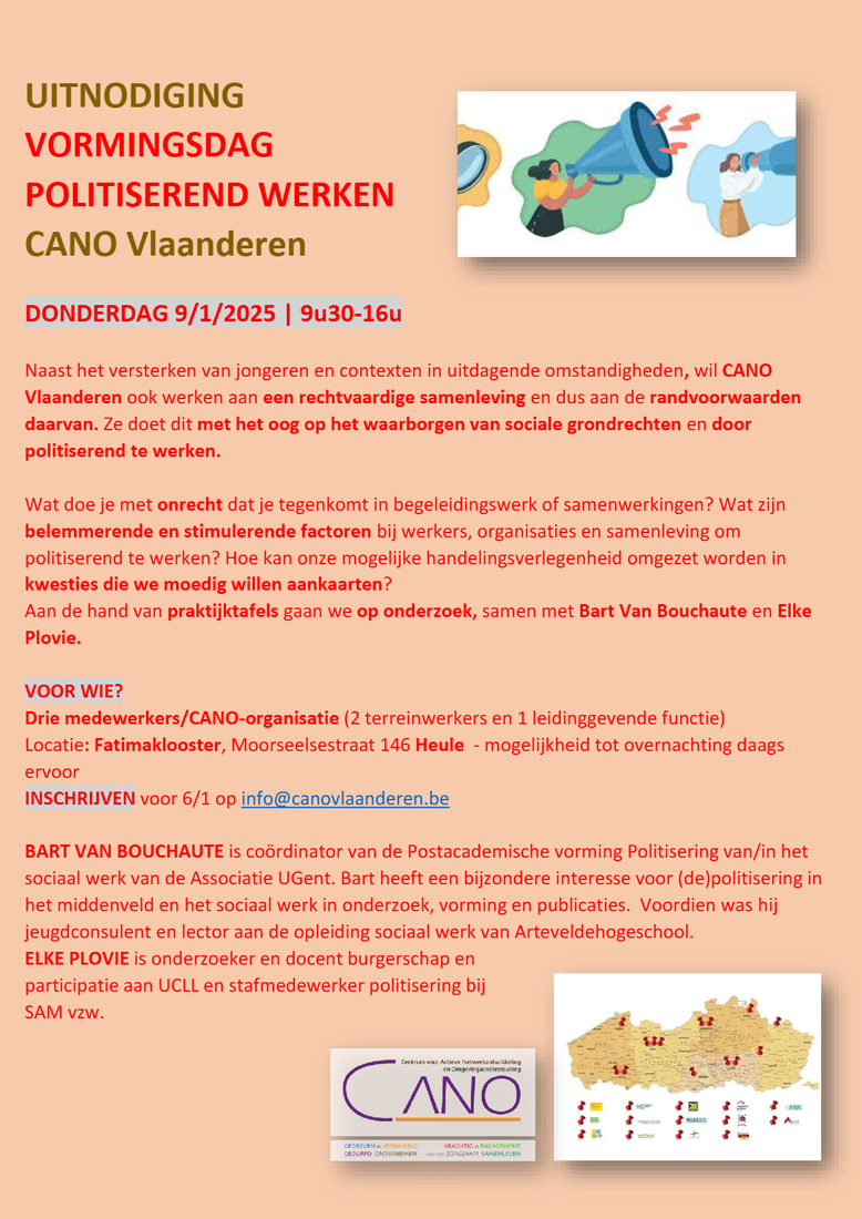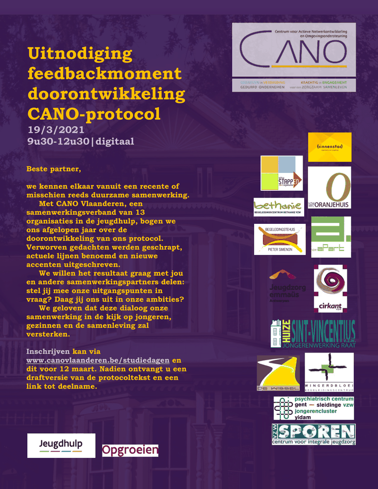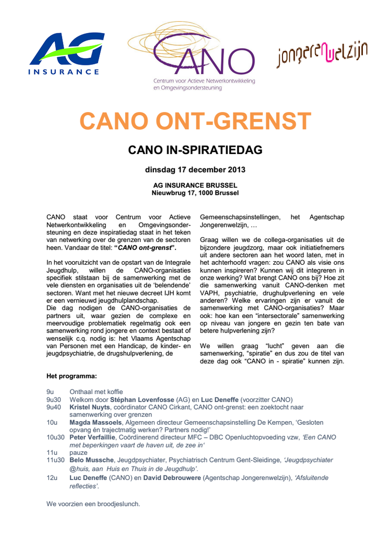 Naar aanleiding hiervan lichten het Agentschap Jongerenwelzijn, het Kabinet Welzijn, Volksgezondheid & Gezin en de CANO-voorzieningen het CANO-concept aan het brede publiek methodisch toe. Deze presentatiedag vindt plaats op 25 februari 2011 in het Provinciehuis van Leuven. We voorzien een boeiende en inspirerende studiedag met in de voormiddag een algemene situering van CANO. In de namiddag plannen we een vijftal thematische sessies die het concept concretiseren. De dag wordt afgerond door Minister Jo Vandeurzen.